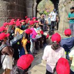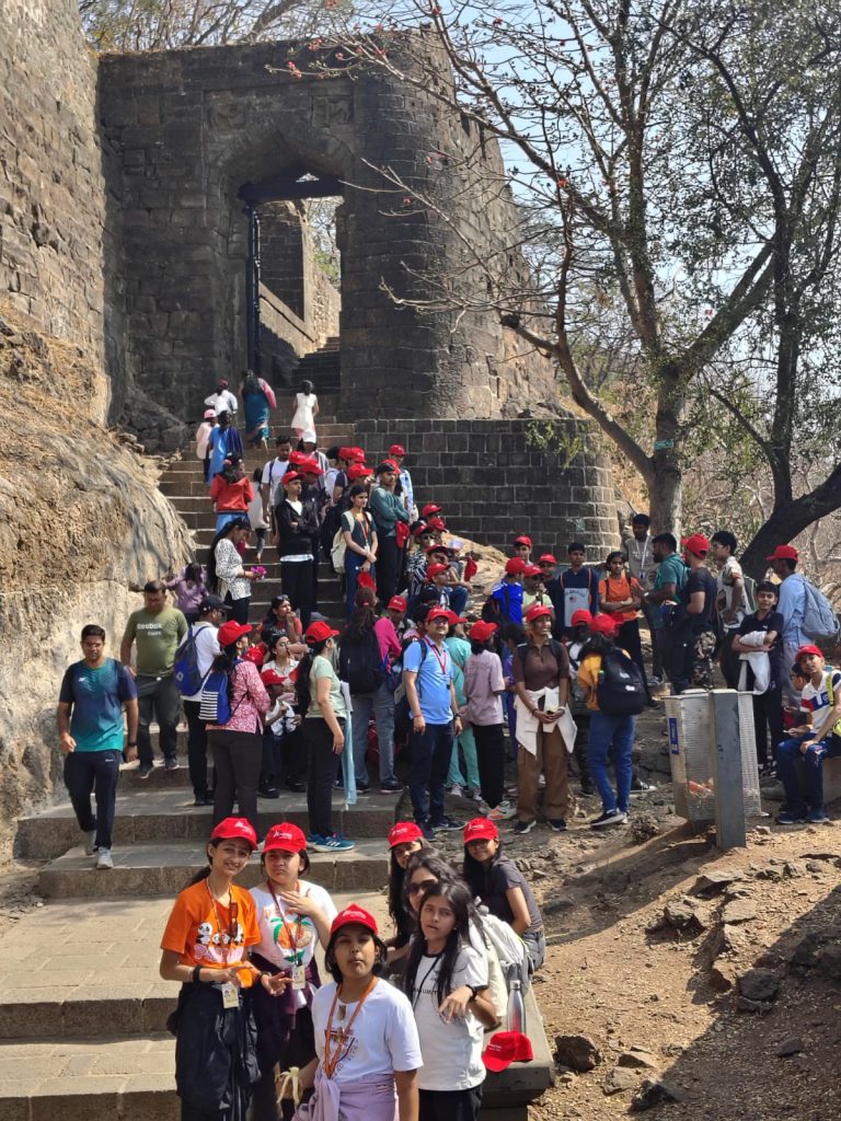 At the summit, the panoramic view of the Sahyadri hills left everyone in awe. Teachers shared stories of Shivaji Maharaj’s childhood at Shivneri, helping students connect classroom lessons with the real environment.